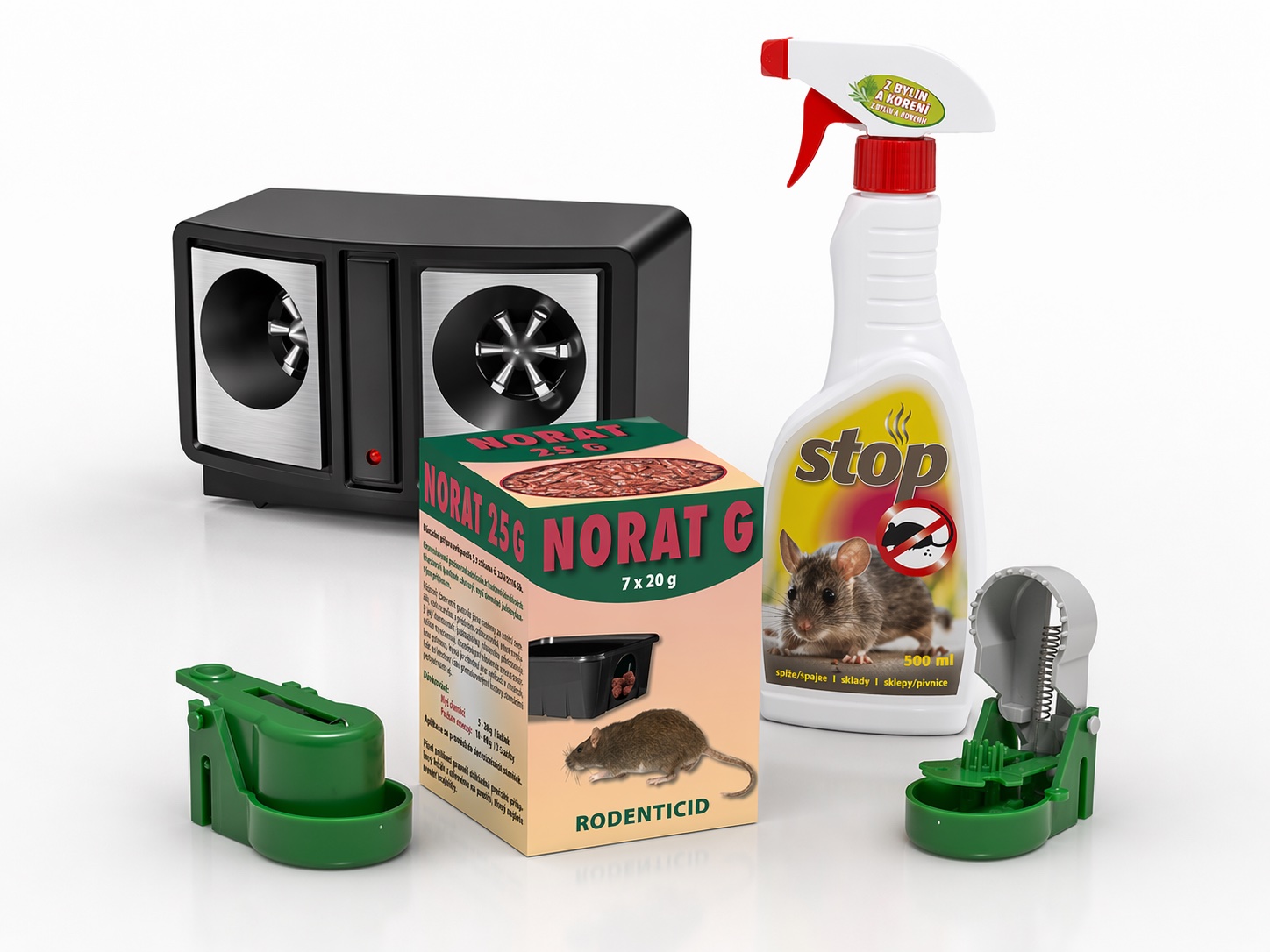 🐭 Sada proti myším 4v1 – kompletní řešení (odpuzovač + sprej + jed + pasti)